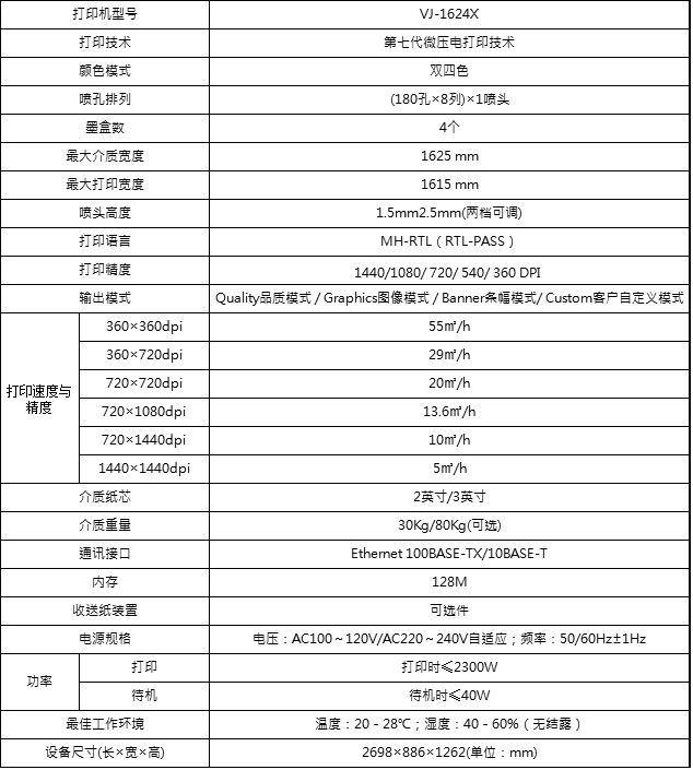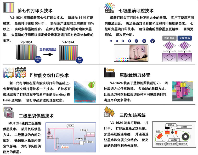 ? 一組第七代打印頭,雙四色(CMYK)打印機;? 最大打印寬度1,615mm,最高打印速度55平米/小時;? 七級墨滴可控技術,I2智能交織打印技術;? 獨創二級墨袋技術,支持介質自動裁切;? 三段智能加熱系統,打印頭高度兩檔可調。